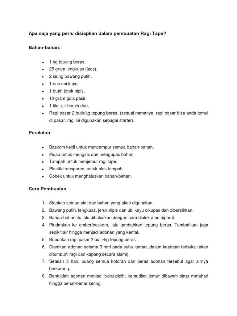 2 keping ragi tape bisa dibeli di pasar harganya 500perak Lihat cara membuat resep ini. Ragi memakan mikroorganisme bersel satu tidak berklorofil dan termasuk golongan Eumycetes. Ragi tape terdapat jenis khamir Saccharomyces cerevisiae yang mempunyai pertumbuhan sempurna pada suhu sekitar 30C.